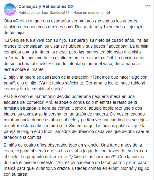 Mi consejo para ti es: “Entiende que tus hijos buscaran imitarte, para ellos tu eres sus ejemplo, por otra parte demuéstrale a tus padres que los ama, que su situación o edad no te aparte de ellos, ámalos más aún de lo que ellos te aman… No lo olvides ¡Tu eres el ejemplo para tus hijos!”